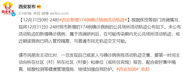荔枝新闻讯 据“西安发布”微博消息,根据疾控等部门流调情况,现将2021年12月31日0-24时西安市新增的174例确诊病例的公共场所活动轨迹公布如下。未公布活动轨迹的新增确诊病例,属于流调研判后,在可能传染期内无公共场所活动轨迹,或近期该病例已纳入管控隔离,与普通市民无轨迹交叉可能。