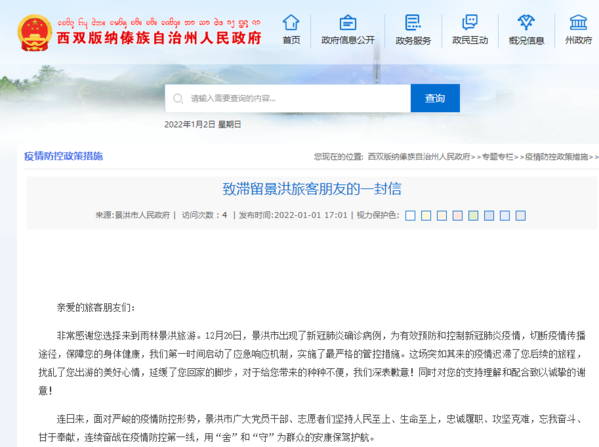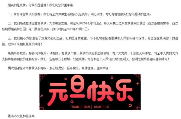 荔枝新闻讯 据西双版纳纳傣族自治州政府网站消息,西双版纳傣族自治州景洪市文化和旅游局2022年1月1日发布了《致滞留景洪旅客朋友的一封信》,主要内容如下: