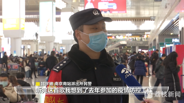 在现场执勤的南京南站派出所民警甘宇驰表示, 听完这首歌想到了去年参加的疫情防控工作,如今中国能在这么复杂的国际环境中,筑起牢固的防疫大坝,感动之余也充满了感恩。