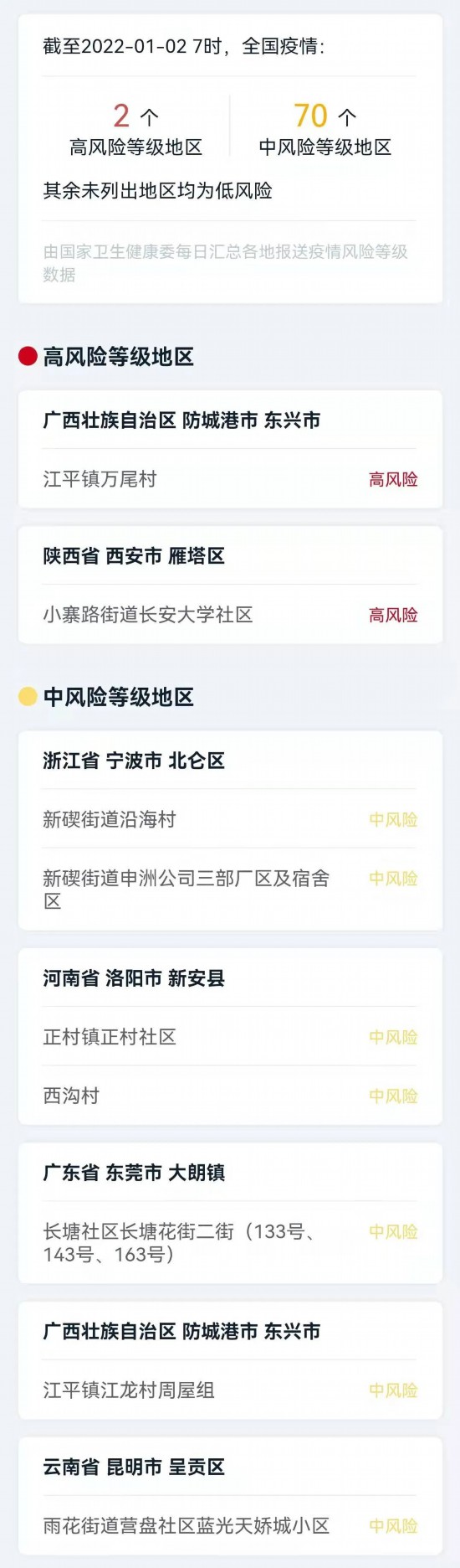 自1月1日起,河南洛阳新安县正村镇正村社区、西沟村调整为中风险地区。