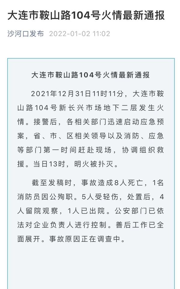 荔枝新闻讯 据“沙河口发布”微信公众号消息,2021年12月31日11时11分,大连市鞍山路104号新长兴市场地下二层发生火情。接警后,各相关部门迅速启动应急预案,省、市、区相关领导以及消防、应急等部门第一时间赶赴现场,协调组织救援。当日13时,明火被扑灭。