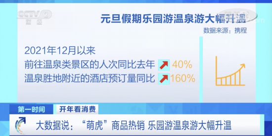 另外,寒冷冬季,温泉游占据出游主题热门位。2021年12月以来,前往温泉类景区的人次同比去年增长40%,温泉胜地附近的酒店预订量同比增长160%。