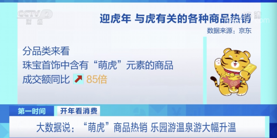 随着虎年的临近,与“虎”有关的各种商品迅速升温。来自京东的大数据显示,2021年12月以来,含有“萌虎”元素的商品成交额同比增长了9.4倍。其中虎年贺岁金条、“萌虎”黄金饰品、“萌虎”新春送福礼盒、虎年生肖纪念酒等贺岁商品成交额居前。分品类来看,珠宝首饰中含有“萌虎”元素的商品成交额同比增长了85倍,含有“萌虎”元素的家纺、礼品、服饰内衣成交额则同比增长了31倍、24倍和14倍。