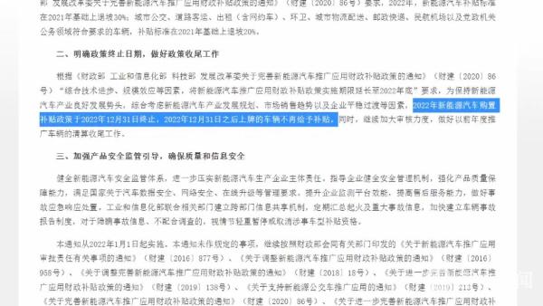 根据财政部等四部委《关于2022年新能源汽车推广应用财政补贴政策的通知》,城市公交、道路客运、出租、环卫、城市物流配送、邮政快递、民航机场以及党政机关公务领域符合要求的车辆,补贴标准在2021年基础上退坡20%。2022年新能源汽车购置补贴政策于2022年12月31日终止,2022年12月31日之后上牌的车辆不再给予补贴。工业和信息化部联合相关部门建立跨部门信息共享机制,定期汇总起火及重大事故信息,加快建立车辆事故报告制度,对于隐瞒事故信息、不配合调查的,视情节轻重暂停或取消涉事车型补贴资格。