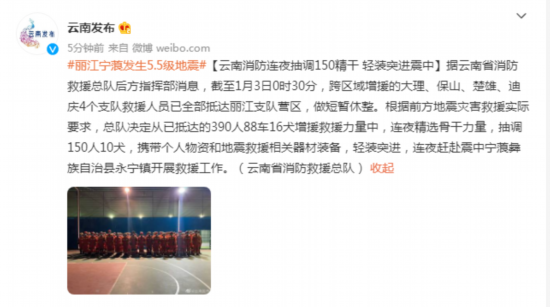 据云南省消防救援总队后方指挥部消息,截至1月3日0时30分,跨区域增援的大理、保山、楚雄、迪庆4个支队救援人员已全部抵达丽江支队营区,做短暂休整。根据前方地震灾害救援实际要求,总队决定从已抵达的390人88车16犬增援救援力量中,连夜精选骨干力量,抽调150人10犬,携带个人物资和地震救援相关器材装备,轻装突进,连夜赶赴震中宁蒗彝族自治县永宁镇开展救援工作。(云南省消防救援总队)