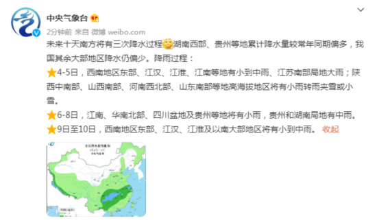 9日至10日,西南地区东部、江汉、江淮及以南大部地区将有小到中雨。
