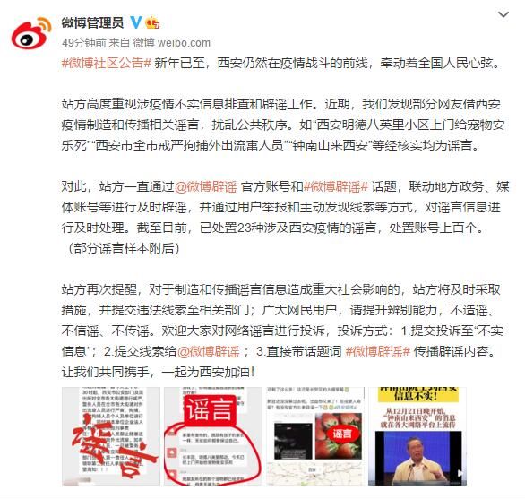 荔枝新闻讯 1月3日,微博管理员发布公告,截至目前,已处置23种涉及西安疫情的谣言,处置账号上百个。公告全文如下:
