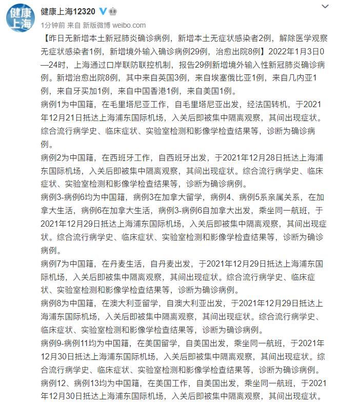 荔枝新闻讯 据上海市卫生健康委员会官方微博消息,2022年1月3日0—24时,通过口岸联防联控机制,上海报告新增29例境外输入新冠肺炎确诊病例。新增治愈出院8例,其中来自英国3例,来自埃塞俄比亚1例,来自几内亚1例,来自牙买加1例,来自中国香港1例,来自美国1例。