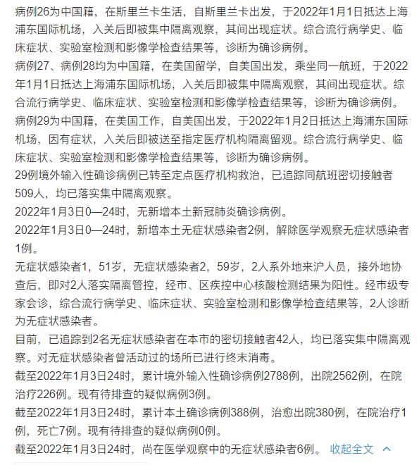 截至2022年1月3日24时,累计本土确诊病例388例,治愈出院380例,在院治疗1例,死亡7例。现有待排查的疑似病例0例。