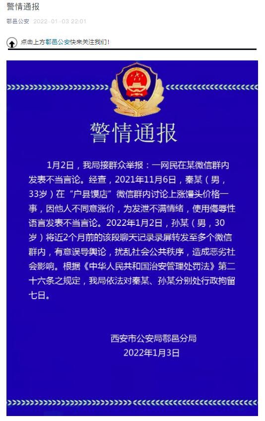荔枝新闻讯 1月3日晚,“鄠邑公安”微信公众号发布警情通报称,1月2日,该局接群众举报:一网民在某微信群内发表不当言论。经查,2021年11月6日,秦某(男,33岁)在“户县馍店”微信群内讨论上涨馒头价格一事,因他人不同意涨价,为发泄不满情绪,使用侮辱性语言发表不当言论。2022年1月2日,孙某(男,30岁)将近2个月前的该段聊天记录录屏转发至多个微信群内,有意误导舆论,扰乱社会公共秩序,造成恶劣社会影响。根据《中华人民共和国治安管理处罚法》第二十六条之规定,该局依法对秦某、孙某分别处行政拘留七日。
