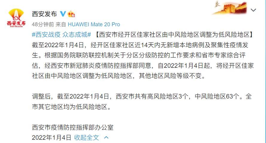荔枝新闻讯 据西安发布官方微博消息,截至2022年1月4日,西安市经开区佳家社区近14天内无新增本地病例及聚集性疫情发生。根据国务院联防联控机制关于分区分级防控的工作要求和省市专家综合评估,经西安市新冠肺炎疫情防控指挥部同意,自2022年1月4日起,将经开区佳家社区由中风险地区调整为低风险地区,其他地区风险等级不变。