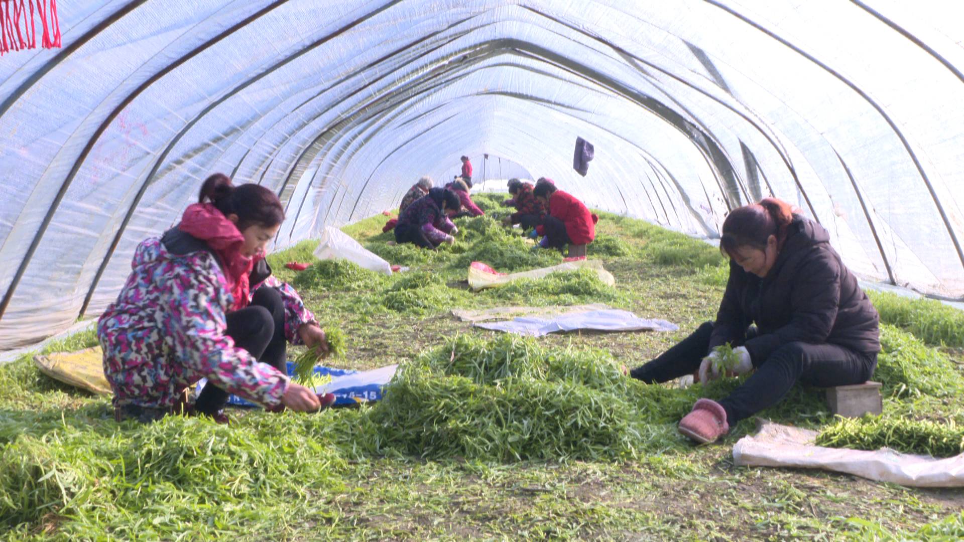 记者申亚东:“芦蒿是利民社区的主导产业,眼下随着春节的临近,也到了芦蒿开棚的日子,可以看到我身后有不少蒿农正在紧张地捋蒿当中。待会儿也会有收购商过来进行收购,尽快让这些芦蒿进入百姓的餐桌上。”