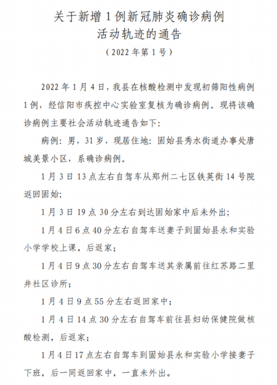 荔枝新闻讯 据“固始网信”微信公众号1月5日发布新增1例新冠肺炎确诊病例活动轨迹的通告: