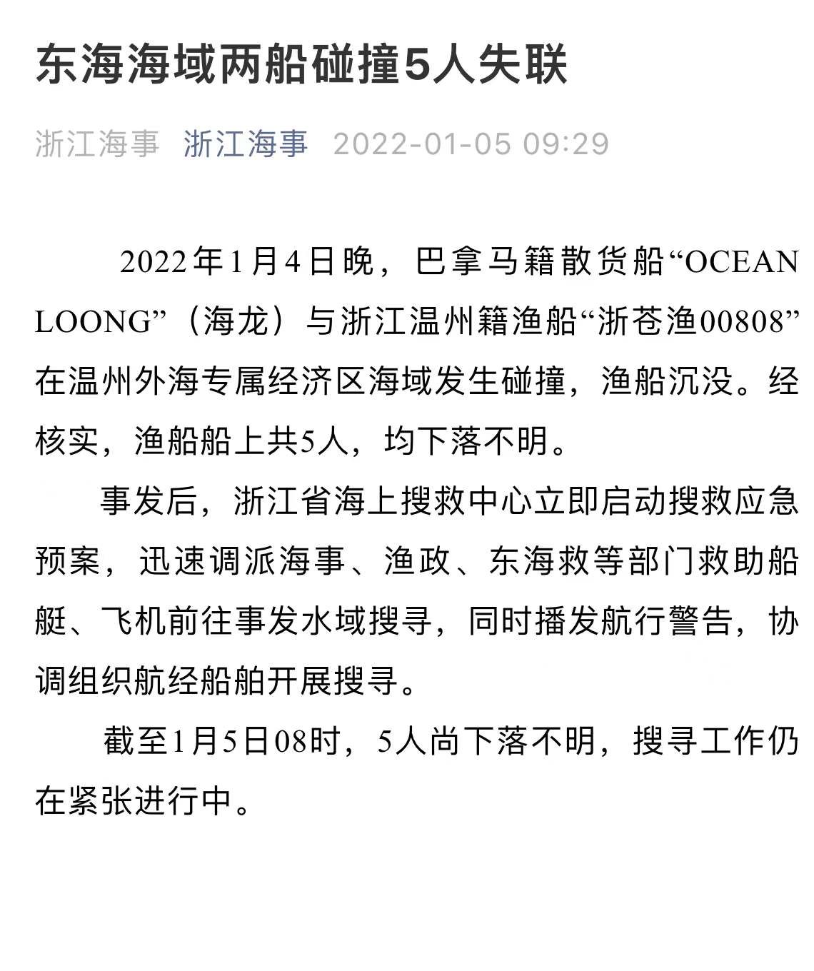 荔枝新闻讯 据“浙江海事”微信公众号消息,2022年1月4日晚,巴拿马籍散货船“OCEAN LOONG”(海龙)与浙江温州籍渔船“浙苍渔00808”在温州外海专属经济区海域发生碰撞,渔船沉没。经核实,渔船船上共5人,均下落不明。