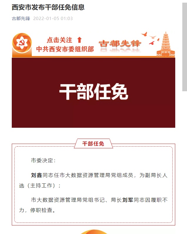 荔枝新闻讯 据古都先锋微信公众号消息,1月5日,西安市委组织部发布消息,西安市委决定:刘鑫同志任市大数据资源管理局党组成员,为副局长人选(主持工作)。西安市大数据资源管理局党组书记、局长刘军同志因履职不力,停职检查。