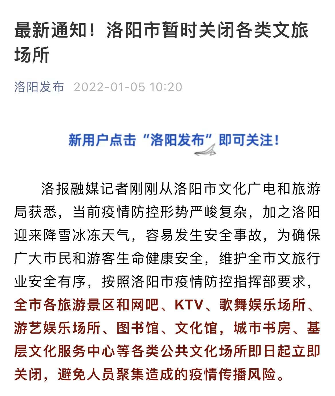 荔枝新闻讯 据“洛阳发布”微信公众号消息,从洛阳市文化广电和旅游局获悉,当前疫情防控形势严峻复杂,加之洛阳迎来降雪冰冻天气,容易发生安全事故,为确保广大市民和游客生命健康安全,维护全市文旅行业安全有序,按照洛阳市疫情防控指挥部要求,全市各旅游景区和网吧、KTV、歌舞娱乐场所、游艺娱乐场所、图书馆、文化馆,城市书房、基层文化服务中心等各类公共文化场所即日起立即关闭,避免人员聚集造成的疫情传播风险。