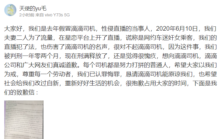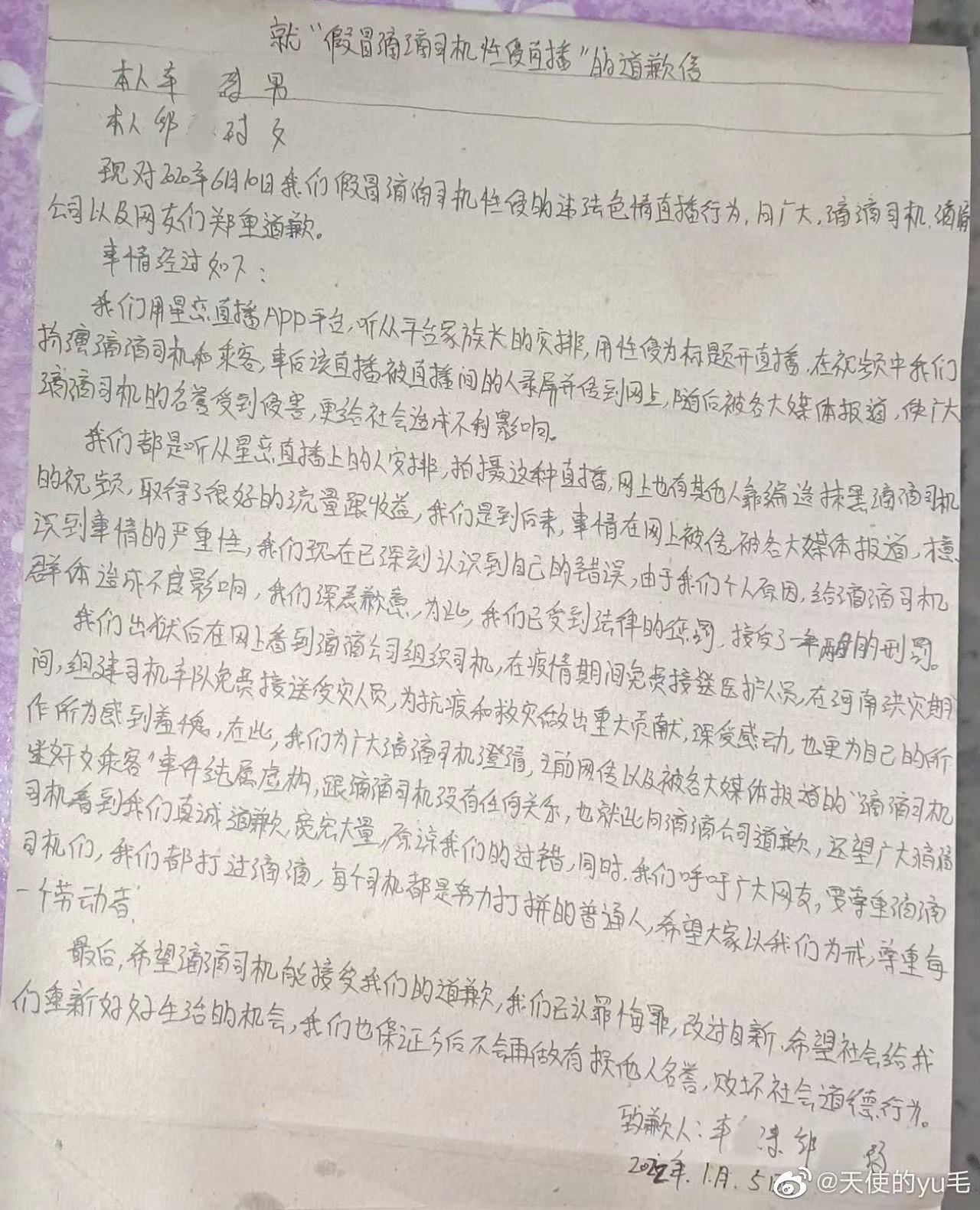 1月5日,“假冒滴滴司机性侵直播案”当事人车某涛和郜某琦在微博账号“天使的yu毛”发布手写信,向滴滴司机、滴滴公司以及网友们公开道歉,寻求公众原谅。据了解,两名当事人因传播淫秽物品被判1年零2个月,目前已刑满释放。