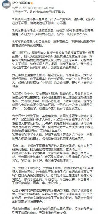 2020年6月13日凌晨,原爆料博主“巧克力翠翠杀”向滴滴致歉,表示愿意承担法律责任。