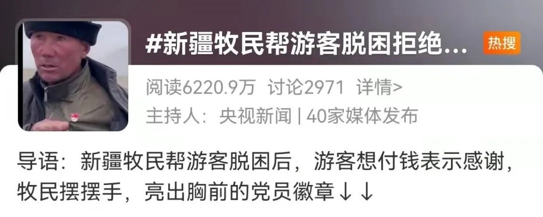 今年1月1日,晋文华在B站上发布了这条牧民大叔亮党员徽章谢绝酬谢的视频。1月2日,这条视频被新疆共青团的抖音号转发,20多万人点赞,随后火遍全国。