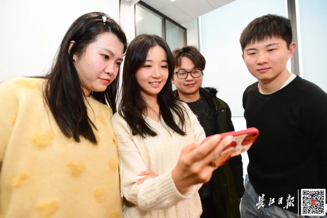 1月4日,姚贝妮、陈远航、詹艺、熊瑞康(从左至右)在展示他们与“亮出党员徽章”的大叔的合影。