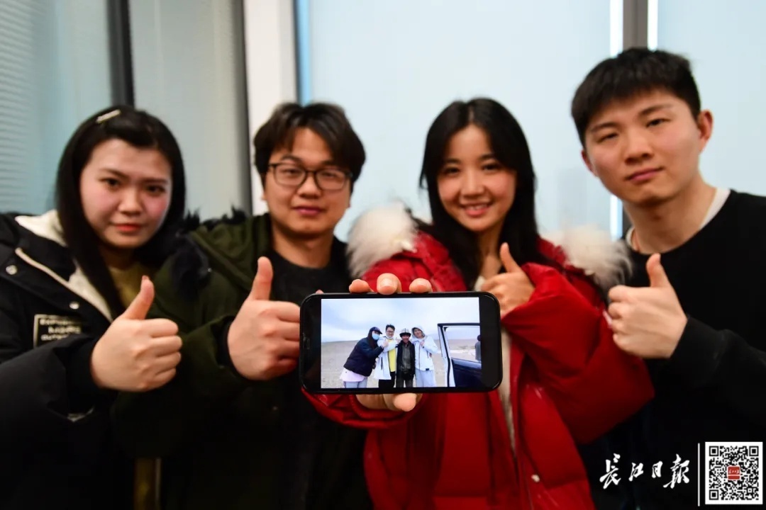 1月4日,姚贝妮、詹艺、陈远航、熊瑞康(从左至右)在看手机里的去年7月在新疆时的视频。