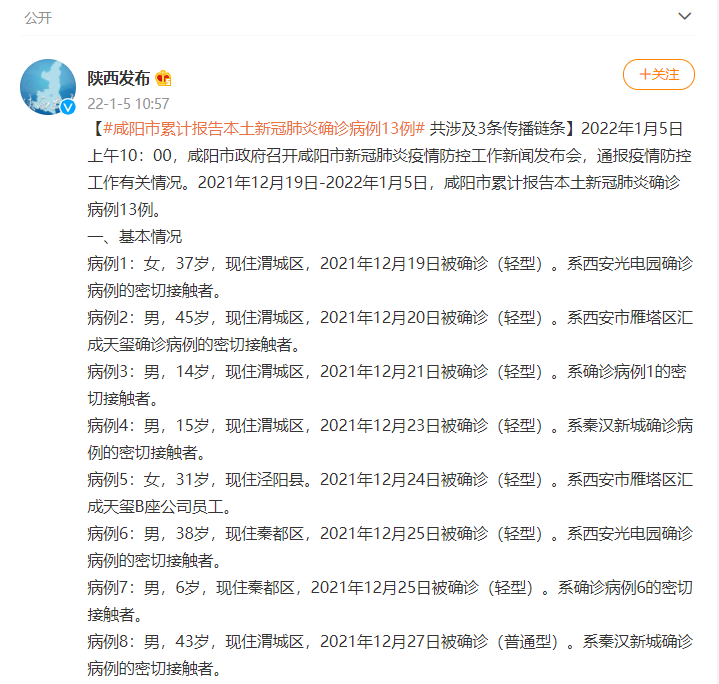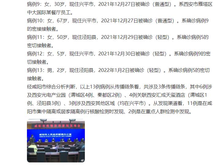 荔枝新闻讯 “陕西发布”微博1月5日消息,2022年1月5日上午10:00,咸阳市政府召开咸阳市新冠肺炎疫情防控工作新闻发布会,通报疫情防控工作有关情况。2021年12月19日-2022年1月5日,咸阳市累计报告本土新冠肺炎确诊病例13例。