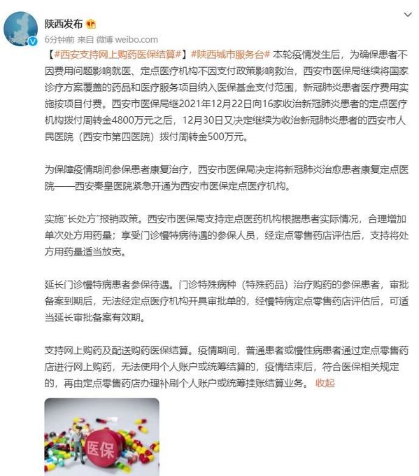 实施“长处方”报销政策。西安市医保局支持定点医药机构根据患者实际情况,合理增加单次处方用药量;享受门诊慢特病待遇的参保人员,经定点零售药店评估后,支持将处方用药量适当放宽。