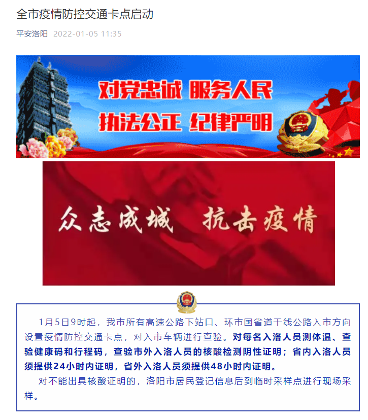 荔枝新闻讯 据“平安洛阳”微信公众号消息:1月5日9时起,洛阳市所有高速公路下站口、环市国省道干线公路入市方向设置疫情防控交通卡点,对入市车辆进行查验。对每名入洛人员测体温、查验健康码和行程码,查验市外入洛人员的核酸检测阴性证明;省内入洛人员须提供24小时内证明,省外入洛人员须提供48小时内证明。
