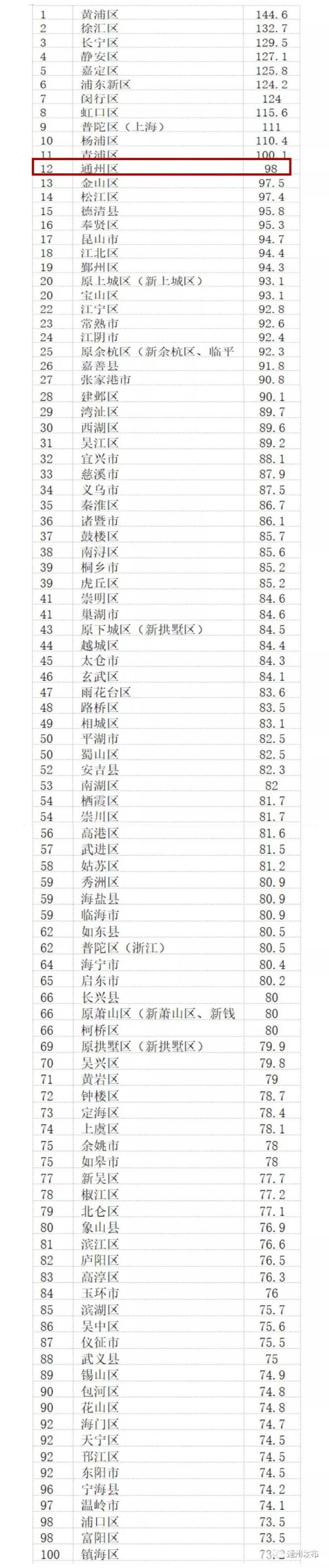 2022年1月4日,江苏省张謇研究会长三角区域治理现代化研究院“长三角县域治理现代化指数研究”课题组,发布全国首个长三角县域治理现代化指数。在包括直辖市市辖区在内的全部201个县域中,江苏省南通市通州区排名第12,省内排名第一。