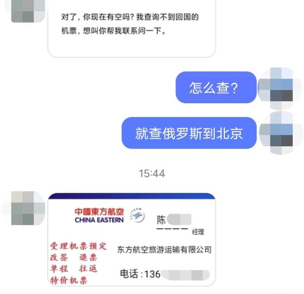 当天下午,郑先生(化名)收到远在俄罗斯留学的“外甥女”发来的信息,因为订不到回国机票,请求舅舅帮忙并发来东方航空“陈经理”的名片。