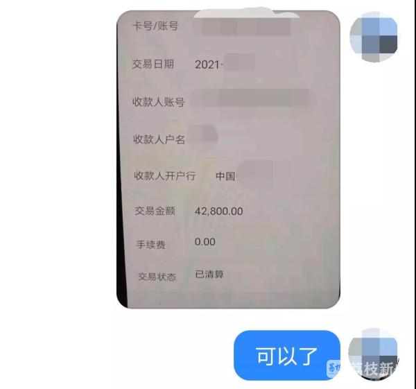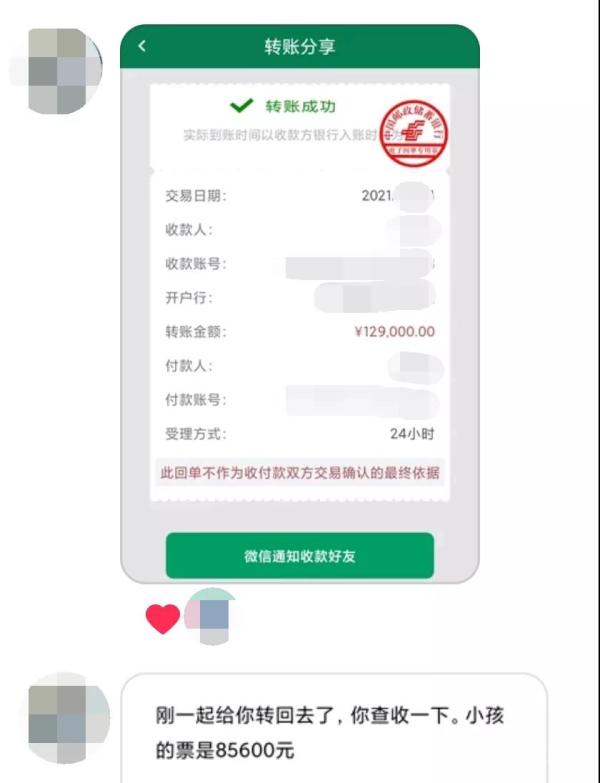 紧接着“外甥女”称,还有两张小孩的同航班机票85600元,也需要尽快办理,并称机票钱129000元已经打给舅舅了,发来了一张转账截图。