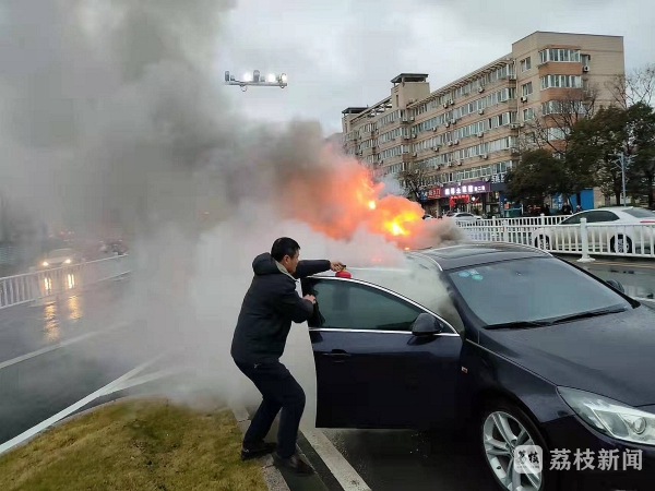 一辆轿车在行使过程中,驾驶室内突然冒出火苗,正当众人眼看着火势蔓延却手足无措之时,一名驾车路过的男子从自己车上拿出灭火器就冲了上去,有效控制了火势的蔓延,随后赶到的消防人员很快将明火全部扑灭。而当事后车主寻找该名男子时,才发现该男子已不声不响地离开了现场。记者随后通过周围市民提供的车牌号码,找了帮忙灭火的射阳县烟草专卖局(分公司)驾驶员蒋恒山。