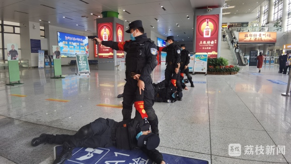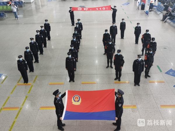 在南京站北进站大厅,南京铁路特警支队用战术射击枪操酷炫开场,气氛瞬间拉满。战术操结束后,全体民警快速集合,利用“快闪”的形式组成“110”的图案,献礼第二个人民警察节。