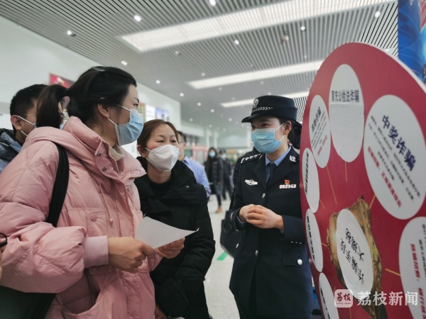 同时,为了增强旅客防范电信诈骗意识,守护旅客财产安全,现场还开展了反电诈知识讲解。一幅幅防范电信诈骗的宣传展板、一件件精心制作的宣传海报,吸引了许多旅客。现场,民警还利用快板的形式,带领旅客学习反诈口诀,并利用手持展板的方式给旅客防范电信诈骗“支招”。期间,还邀请旅客现身说法,有奖竞答,民警及时答疑解惑,并为旅客送上印有防诈标语的“安全出行锦囊”。同时,还为现场的旅客发放印有“防范电信诈骗,给您的手机加把锁”标语的手机锁扣,提醒旅客在遇到电信诈骗时多留心,勿轻信,为手机账户加把锁。