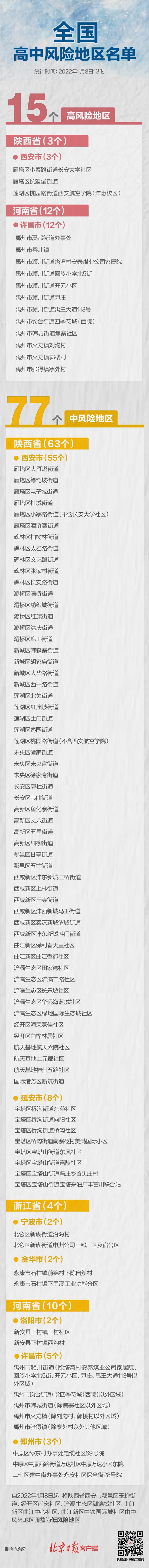 自2022年1月8日起,陕西省西安市鄠邑区玉蝉街道、经开区尚宏社区、浐灞生态区御锦城社区、曲江新区曲江中心社区、曲江新区中铁国际城社区由中风险地区调整为低风险地区,其他地区风险等级不变。