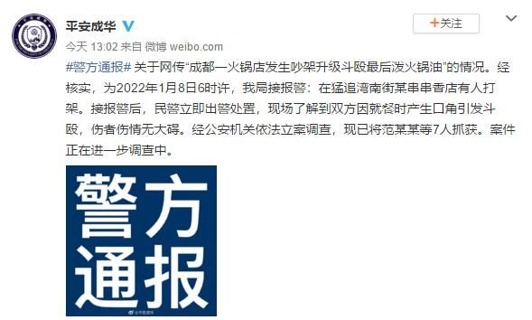 荔枝新闻讯 成都市公安局成华区分局官方微博1月8日发布一则警方通报,称关于网传“成都一火锅店发生吵架升级斗殴最后泼火锅油”的情况。经核实,为2022年1月8日6时许,我局接报警:在猛追湾南街某串串香店有人打架。接报警后,民警立即出警处置,现场了解到双方因就餐时产生口角引发斗殴,伤者伤情无大碍。经公安机关依法立案调查,现已将范某某等7人抓获。案件正在进一步调查中。