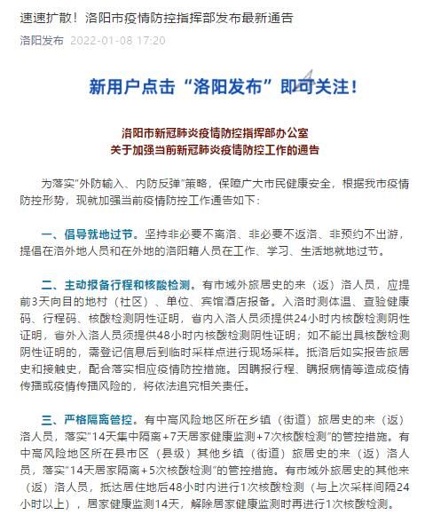 荔枝新闻讯 据“洛阳发布”微信公众号1月8日消息,洛阳市新冠肺炎疫情防控指挥部办公室发布关于加强当前新冠肺炎疫情防控工作的通告。全文如下: