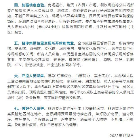 七、做好个人防护。非必要不前往发生本土疫情的城市,非必需不前往中高风险地区所在地市。出行期间要尽可能错峰出行,备好防护物品,遵守秩序、有序排队,全程佩戴口罩,途中做好手消毒等个人防护,不扎堆、不聚集。及时接种疫苗,保护自己和家人的健康。