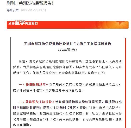 二、外省返乡主动报备。外省低风险地区人员如确需返芜,请携带48小时内核酸阴性证明,提前、主动向村(社区)报备,旅途中做好个人防护、健康监测等措施,时刻关注健康码、行程卡状态。村(社区)要以社区网格化为单位,加强对省外来(返)芜人员的摸排,引导其做好核酸检测、健康监测等措施。
