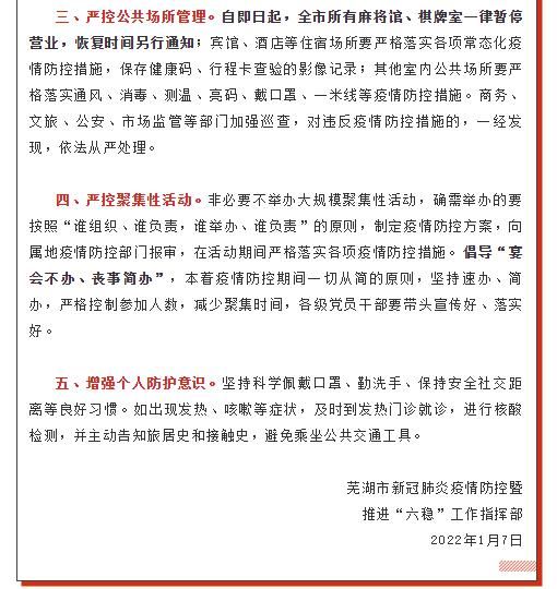 荔枝新闻讯 据“芜湖发布”微信公众号1月8日消息,根据安徽省芜湖市新冠肺炎疫情防控最新通告,自即日起,芜湖市所有麻将馆、棋牌室一律暂停营业,恢复时间另行通知。外省低风险地区人员如确需返芜,请携带48小时内核酸阴性证明,提前、主动向村(社区)报备。