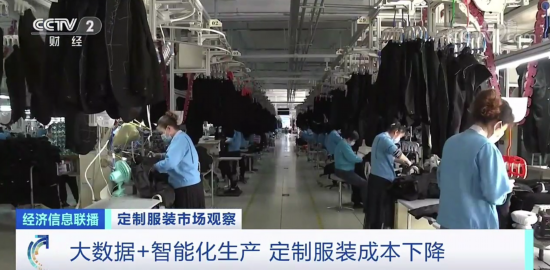 在大连一家定制服装的工厂,智能化应用无处不在,几个工人经过电脑智能排版,选好了一件西服所需要的各种面料,不到一分钟就可以完成裁剪。此外,工厂还实现了智能吊挂、智能成品仓储等全流程的数字化生产。