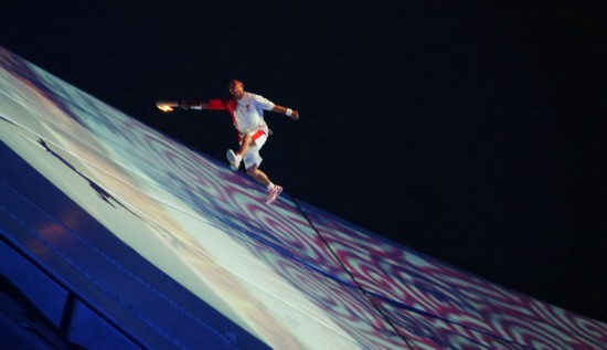 2008年8月8日,最后一棒火炬手李宁在北京奥运会开幕式上凌空绕场一周,准备点燃主火炬。新华社记者费茂华摄
