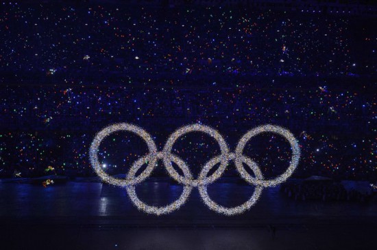 2008年8月8日晚8时,北京奥运会开幕式现场出现的五环标志。新华社记者杨磊摄