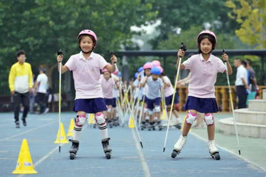 2019年6月21日,中关村第三小学的学生们在上旱地越野滑雪教学课。新华社记者沈伯韩摄