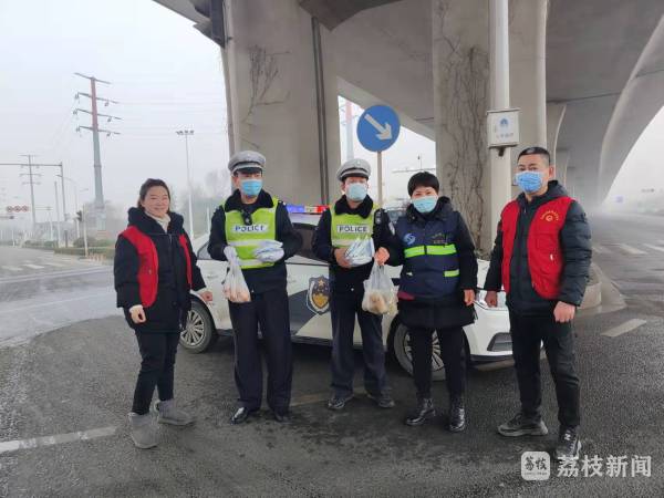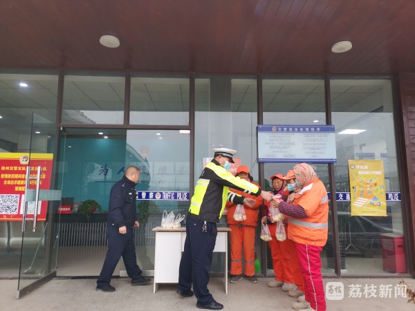 同一时间,开发区交警大队东店子中队民警也买来包子鸡蛋热粥,在中队驻点向辖区环卫工人送上真挚的慰问和衷心的感谢,感谢他们在寒冷的天气下发扬吃苦耐劳、坚守岗位的精神,保障了辖区环境卫生整洁干净。