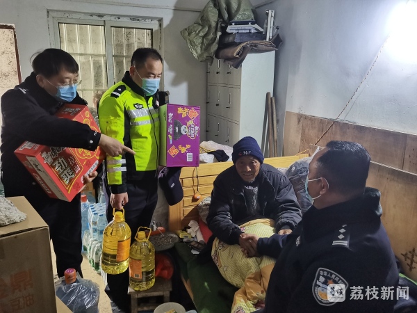 上午,开发区大队一、二、徐庄中队民警,带着深切的关怀和奶、油、面等生活物资,深入辖区蟠桃社区某特困家庭开展走访慰问活动,活动中,民警与特困人员进行促膝谈心,询问了解当前收入来源及家庭情况,并送上温馨的祝福。