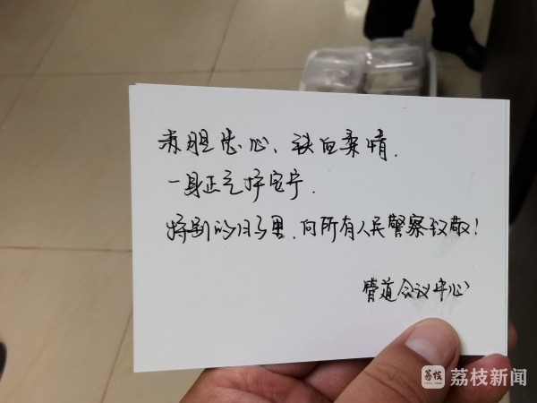 中午12点左右,管道会议忠心的工作人员专程赶到徐州云龙交警大队六中队,给辛苦工作在一线交警送来两筐饭菜,每一份盒饭上都贴着一张贺卡,贺卡上写着:“赤胆忠心,铁血柔情,一身正气护安宁。