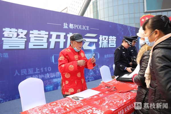 剪纸致“警”。盐都警方专门邀请盐城市非物质文化遗产剪纸传承人王柏林老先生来到110宣传日活动现场,现场剪纸《110关爱民生 保障民生》等系列作品,为群众展演,并赠与人民警察。