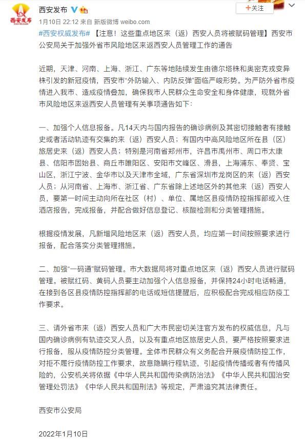 荔枝新闻讯 据@西安发布 微博1月10日晚消息,西安市公安局发布关于加强外省市风险地区来返西安人员管理工作的通告。