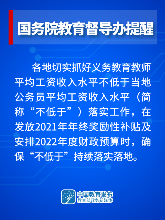 国务院教育督导委员会办公室2022年将继续密切关注各地义务教育教师工资收入“不低于”落实情况,对落实不到位的地方将实行挂牌督导。